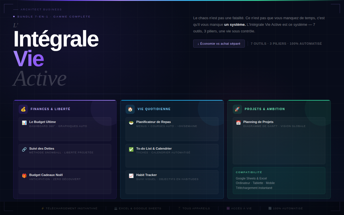 Le chaos n’est pas une fatalité. Ce n’est pas que vous manquez de temps, c’est qu’il vous manque un système. L’Intégrale Vie Active est ce système : un véritable « tableau de bord » pour votre quotidien, regroupant les 7 outils les plus puissants pour automatiser votre organisation et retrouver enfin une clarté d’esprit totale.