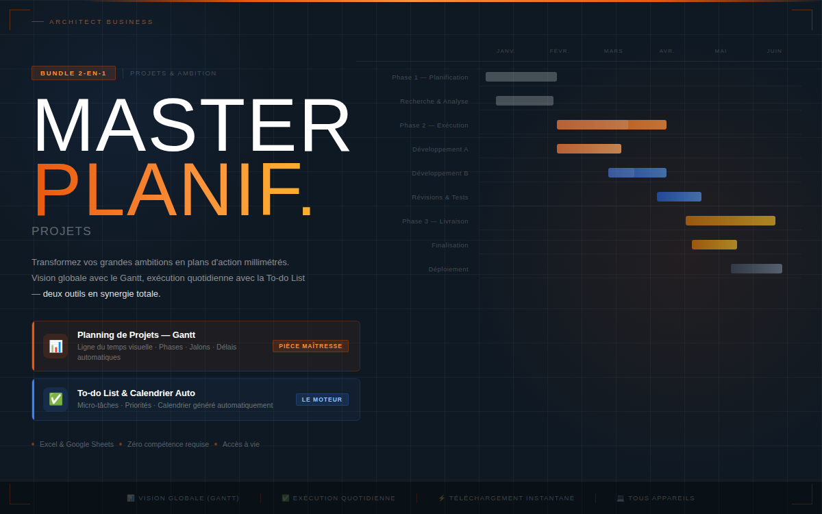 Face à une montagne de tâches, on finit souvent par procrastiner ou se sentir submergé. On oublie des étapes, les délais s’allongent et le budget s’envole. C’est ici que le Master Planificateur Projets intervient : il transforme votre vision floue en un plan d’action millimétré et visuel.